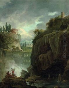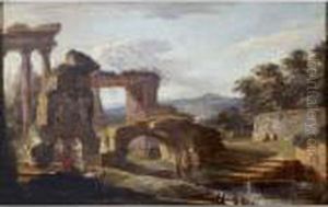 An Italianate Landscape With Peasants On A Bridge Before Awaterfall