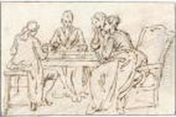 Four Figures Seated Around A Table, Playing Backgammon