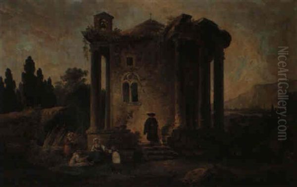 Italianate Landscape With Figures Before A Round Church