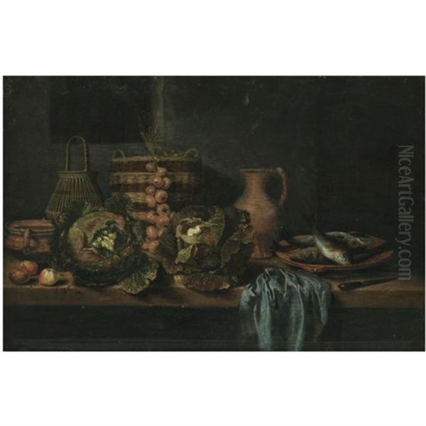 A Still Life With Cabbages, Onions, Apples, A Knife, Wicker Baskets And Earthenware Jugs On A Table, Together With A Plate Of Fish And A Blue Cloth