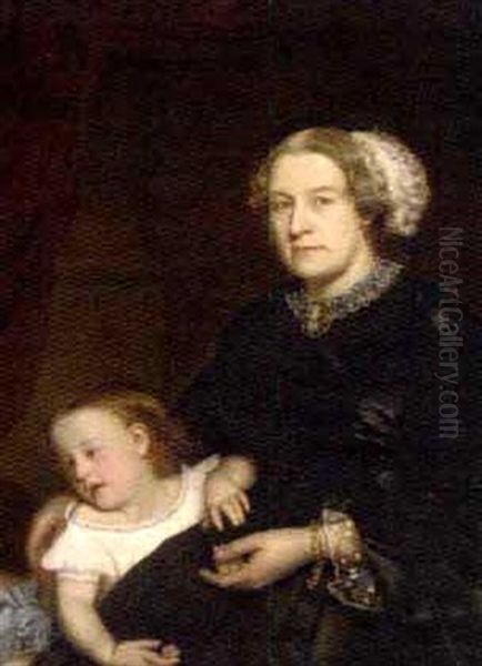Portrait Of Mother And Child Seated, The Mother In A Black Dress With Lace Trimming, Her Daughter By Her Side