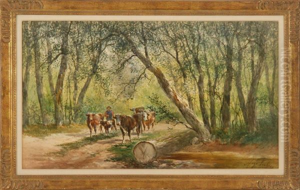 A Shepherd With Cows Walking Through A Wooded Landscape