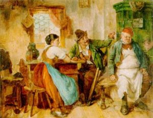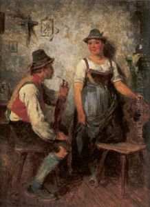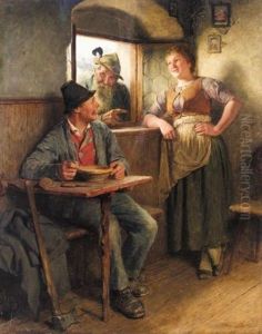 In Einer Wirtsstube Scherzt Ein Bauer Mit Einer Jungen Magd, Die Verlegen Zur Seite Blickt