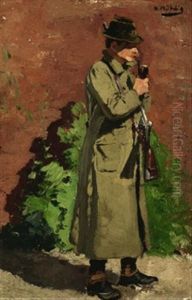 Schafhirte Mit Hund An Lagerfeuer. Im Hintergrund Links Seine Grasende Herde