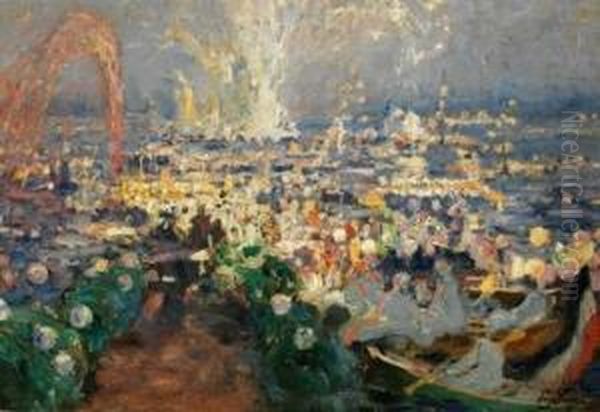 Bring the timeless beauty of Hugo Vogel's Feuerwerk Am Uhlenhorster Fahrhaus into your home with a handmade oil painting reproduction. Carefully recreated on canvas by skilled artists using traditional techniques, this piece captures the delicate brushwork, subtle light, and vibrant color of the original masterpiece. With museum-level quality and rich texture, it brings elegance and artistic depth to any space. Enjoy free shipping and make this masterpiece a part of your personal collection.