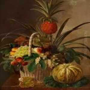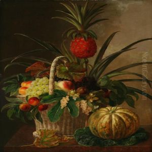 Still Life With Pineapple, Grapes, Peaches, Nuts, Berries And Leaves In A Basket