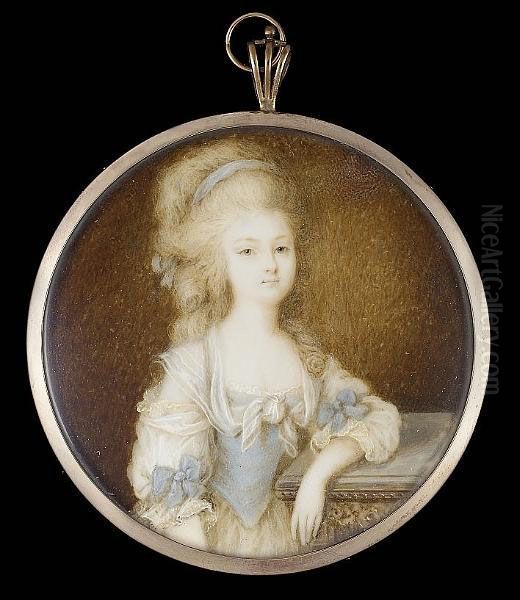 A Lady, Wearing White Dress With Pale Blue Bodice And Matching Bows On The Short Sleeves, White Scarf Tied At Her Corsage And Pale Blue Bandeau In Her Powdered Hair, She Rests Her Left Arm On A Marble-topped Plinth