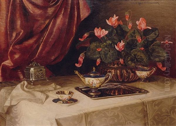 Stilleben Mit Teeservice Und Alpenveilchen