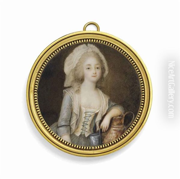 A Young Lady Disguised As A Milkmaid, In Light Grey Dress, Open To Reveal White Corset With Blue Strings, White Mob Cap Over Her Curled Hair Dressed In Ringlets, Her Left Arm Resting On A Milk Jug