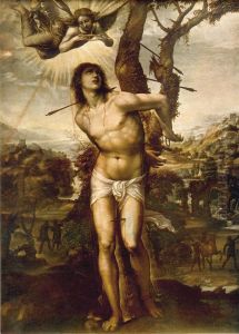 Saint Sebastian (recto); sketches of a male head and a standing figure in a short cape; a copy of the figure on the recto (verso)
