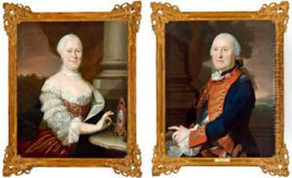 Ritratto Di Un Generale Dell""""""""artiglieria Con Una Mappa Di Una Fortificazione Sulla Quale Sono Segnate Le Postazioni Del Presunto Avversario Con Propri Tiratori; Ritratto Della Sua Consorte Con Un Orologio Da Tavolo Dorato
