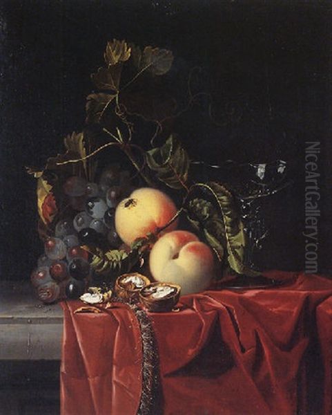A Still Life Of Grapes, Peaches, Walnuts And A Wine Glass Upon A Ledge Draped With A Red Cloth