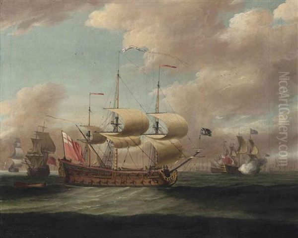 A Royal Navy 4th Rate Arriving At The Anchorage, With The Fleet Announcing Her Arrival Beyond