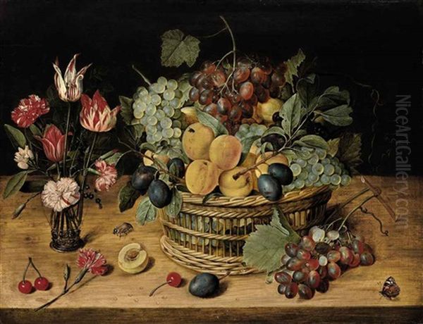 Carnations, Tulips And Other Flowers In A Glass Vase With Peaches, Grapes And Plums In A Basket On A Ledge With Cherries, A Butterfly And A Beetle