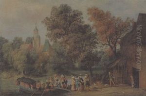A River Landscape With Figures Loading Barges And A Ferry In The Foreground, A Village Beyond