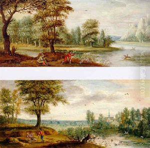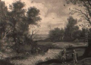 Travellers On A Wooded Path And Hunters In A Field, An Extensive River Landscape Beyond