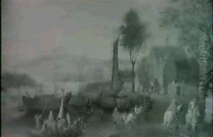 Bewaldete Flusslandschaft Mit Rastenden Bauern Und Maultieren