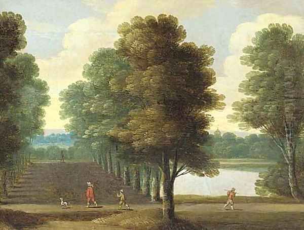 A wooded landscape with an elegant traveller in an avenue of trees by a lake