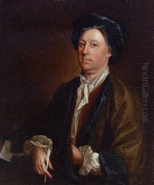 Portrait Of A Gentleman, In A Green And Blue Cloak And Blue Hat, Holding A Quill