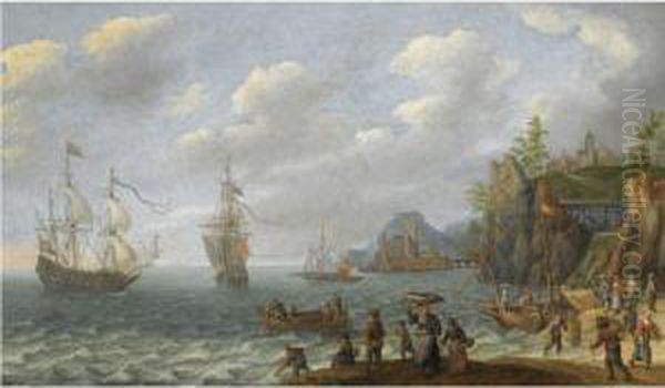 A Coastal Landscape With Two Dutch Merchant Ships And Otherbarges In Choppy Waters Off The Coast, Fishermen Unloading Theircatch In The Foreground, A Hill Top Town Beyond