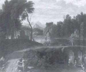 Figures In A Classical Wooded Landscape, With Mountains And A Lake Beyond