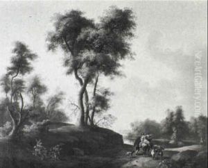 A Wooded River Landscape With Huntsmen And Their Dogs