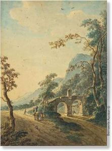 Toegeschreven. Figuren Bij De Brug. Bruine Inkt En Aquarel. Gemonteerd Onder Passe-partout