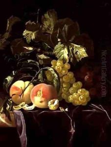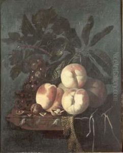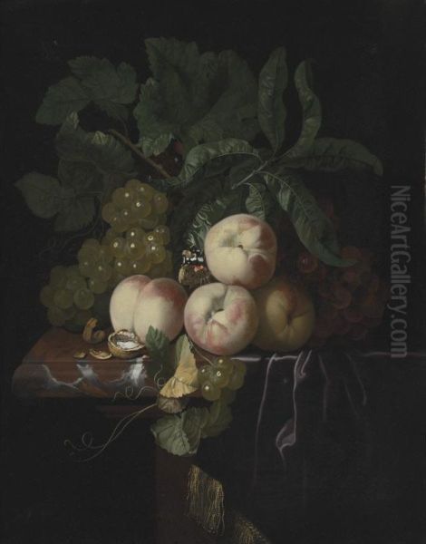Still Life Of Peaches And Bunches Of Grapes Resting On A Marble Ledge