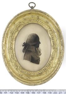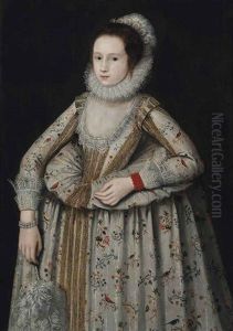 A Lady, Profile To The Right, Wearing Dress With Lace Trim, Ruff And Scarf About Her Neck And Strings Of Pearls In Her Hair