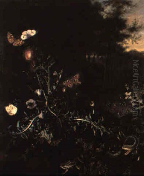 A Thistle, Convolvulus, Butterflies, Frog, Snake And Dragonflies