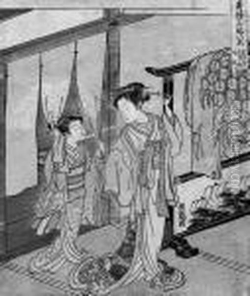 Oryusai Chuban . Serie: Seiro Meifu Hakkei . Neben Einem Paravent Steht Eine Kurtisane. In Der Tur Steht Ihre Kamuro, Die Den Vorhang In Den Handen Halt. Bez.: Koryu Ga. Um 1770. Guter Druck, Farben Etwas Verblasst, Rander Leicht Beschnitten,