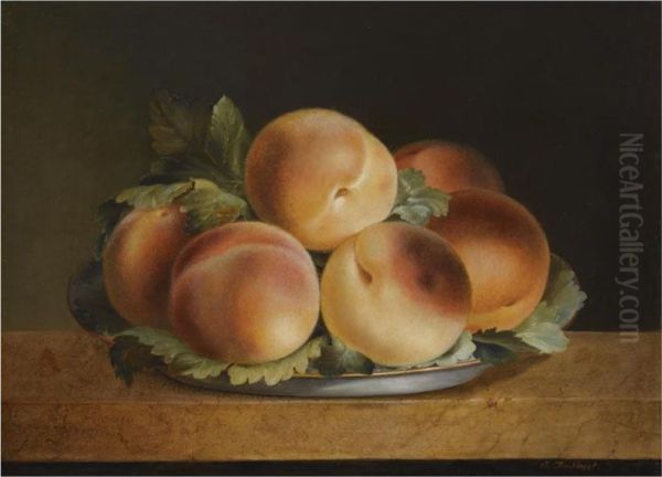 A Still Life Of Peaches In A Pewter Bowl
