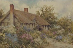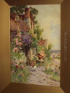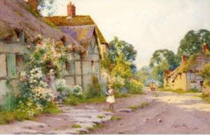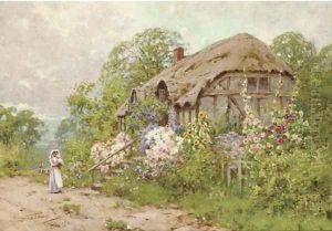 Two Children with a Rabbit Outside a Cottage by the Sea