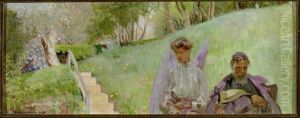 In front of the houe - artist's wife and daughter