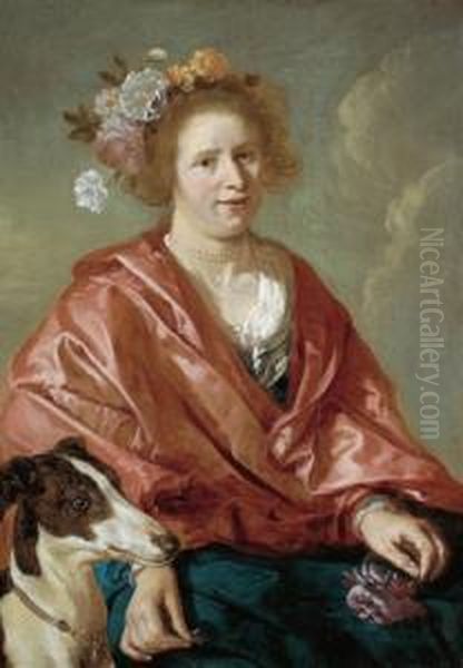 Ritratto Di Una Signora Con Fiori Nei Capelli E Un Levriero