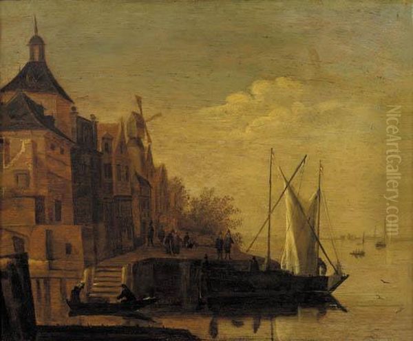 A Town By A River With Sailing Vessels Moored At A Quay, At Dusk