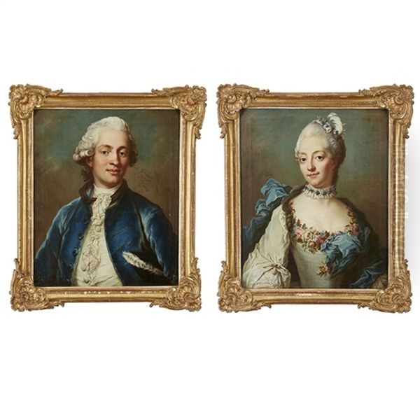 Portratt Av Greve Gustaf Adolf Gyllenborg (1743-1789) Ikladd Bla Rock Och Vit Vast Med Trikorn Under Vanster Arm Och Hans Maka Petronella Hultman (1748-1783) Ikladd Blombestrodd Vit Klanning Med Bla Schal - 1 Par Midjebilder Efter Pasteller Av Gustaf Lund