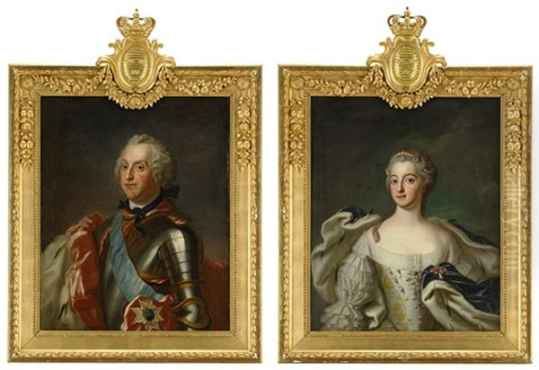Portratt Av Kung Adolf Fredrik (1710-1771) Ikladd Rustning Och Hermelinbramad Mantel I Purpur, Barandes Serafimerordens Bla Band Samt Storkorskraschan, Och Hans Maka Drottning Lovisa Ulrika (1720-1782) Ikladd Broderad Klanning Med Hermelinbrama (pair)
