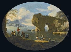 A Coastal Landscape With Fishermen On The Shore Near Classicalruins, A Mountain Range Beyond