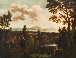 Figures Bathing Before A Waterfall, A View To Tivoli In The Distance