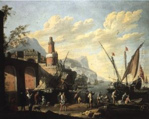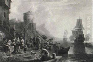A Mediterranean Coastline With Travellers On The Shore And A Man-o'-war
