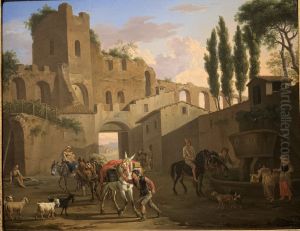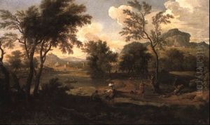 An Arcadian Landscape With Travellers Conversing, A Peasant Woman Resting