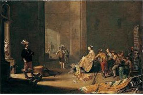 A Palatial Guardroom Interior With Soldiers And Courtesans Conversing
