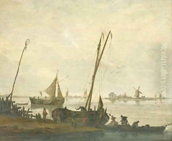 Fishermen mooring their boats on the bank of a river, a sailing boat and a river bank with windmills beyond