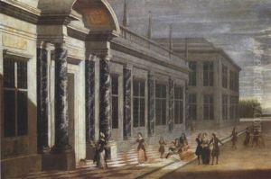 Elegant Figures Strolling In A Palace Garden
