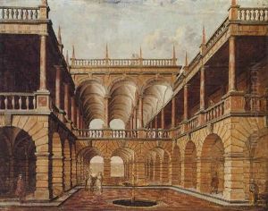 An Architectural Capriccio With Figures In A Classical Courtyard Before A Well