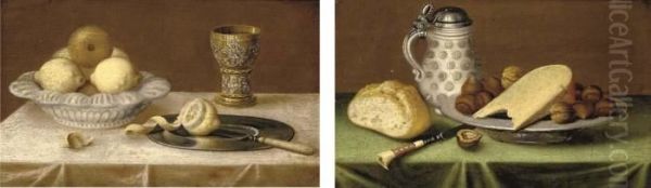 Lemons In An Earthenware Dish, A Silver Gilt Goblet, A Pewter Plate On A Draped Table; And An Earthenware Tankard, A Bread Roll, A Pewter Dish Of Hazlenuts And Cheese On A Draped Table