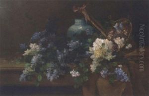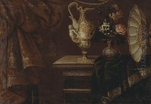 Plums, Grapes And A Vase Of Carnations On A Draped Table