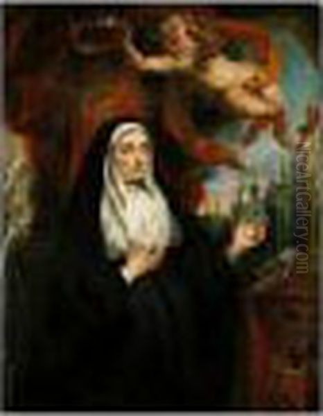 Portrait Of The Infanta Isabella Clara Eugenia, As A Nun, Half-length In Prayer Before A Crucifix And Crowned By A Cherub, With An Abbey Beyond