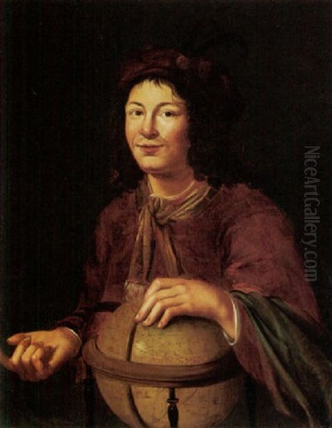 Portrait Of A Young Man (democritus?) Wearing Red With A Plumed Hat, Holding A Globe